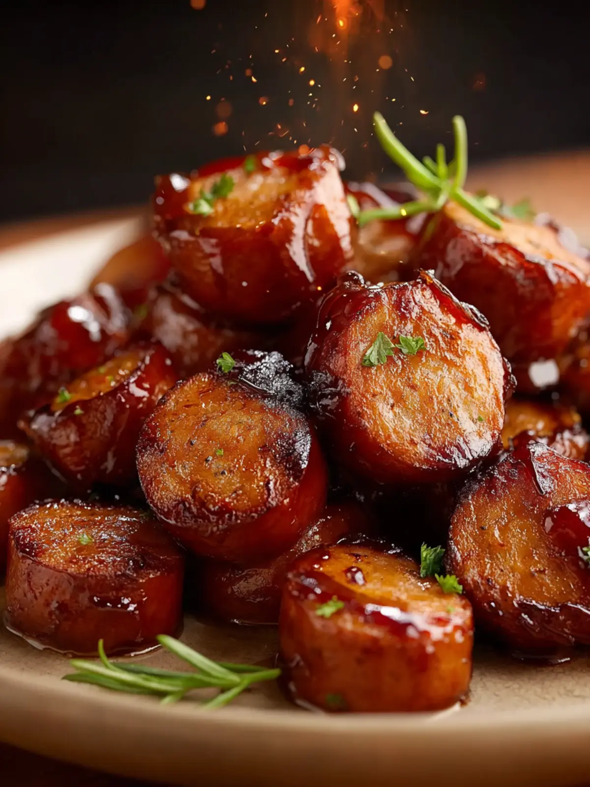 Delicious smoked sausage bites coated in barbecue sauce, perfect as an appetizer.