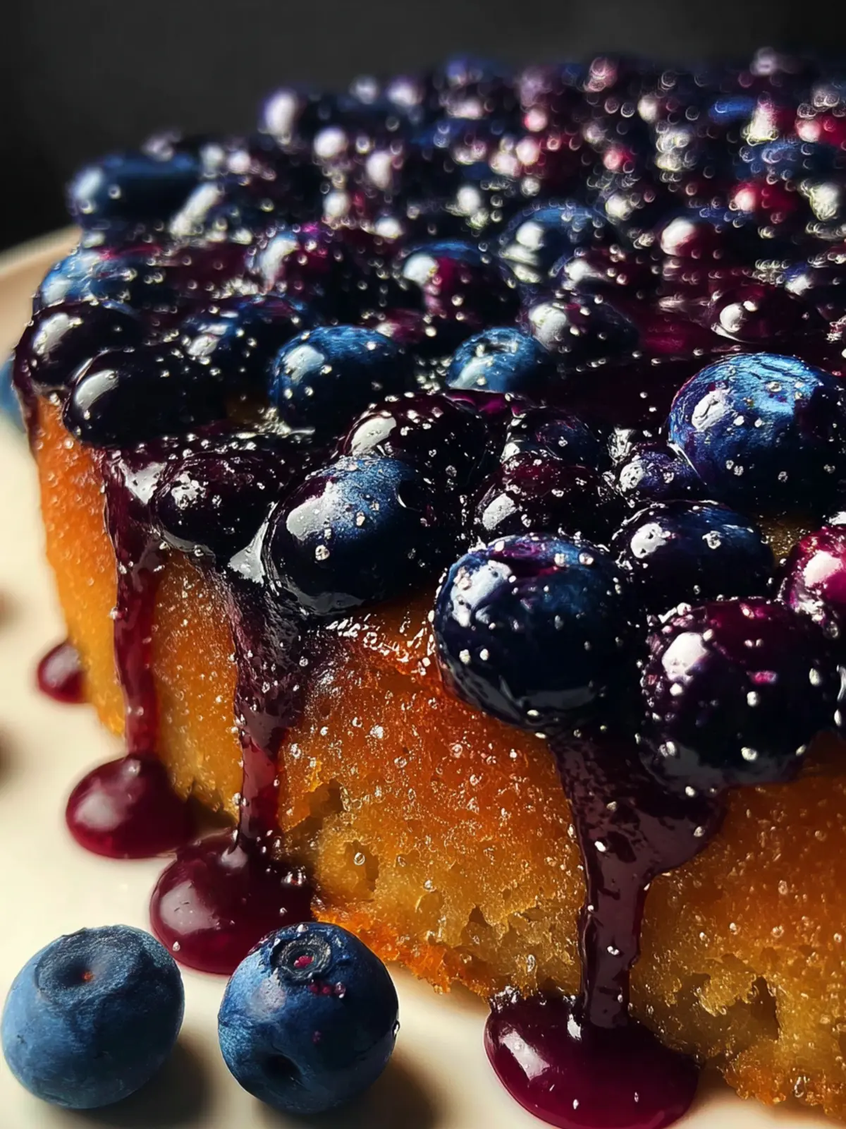 A delightful upside-down cake featuring fresh blueberries and a caramel-like topping.