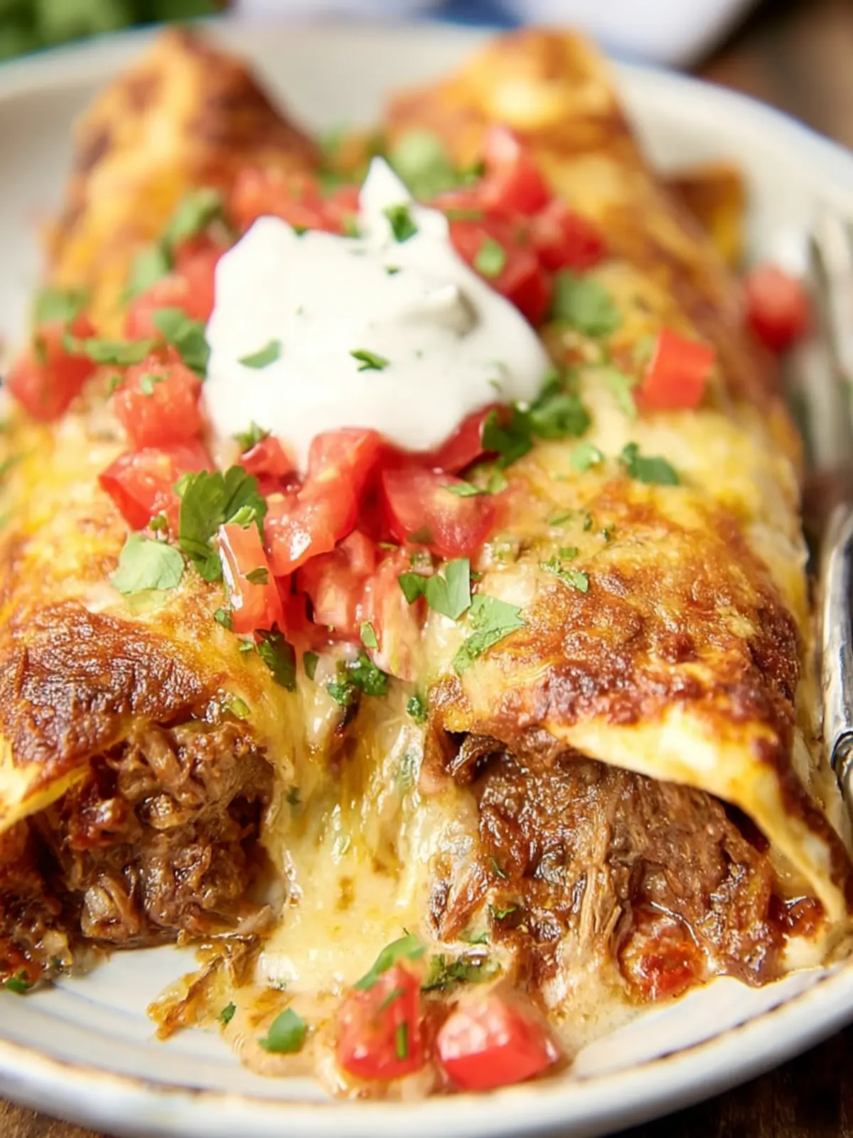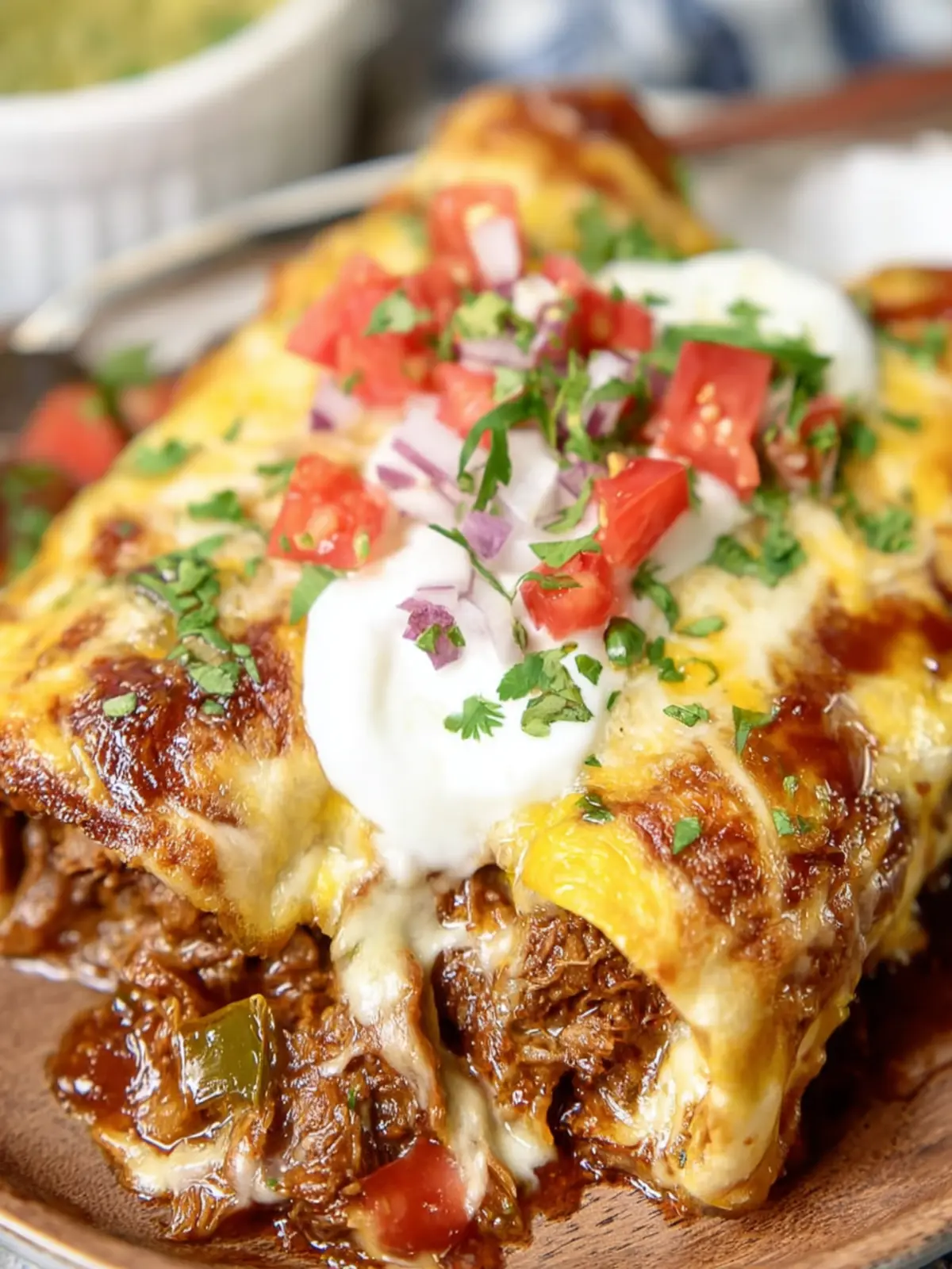 Delicious cheesy brisket enchiladas topped with the perfect blend of flavors and served with your favorite toppings.