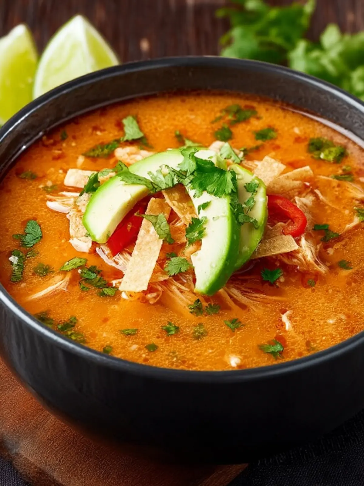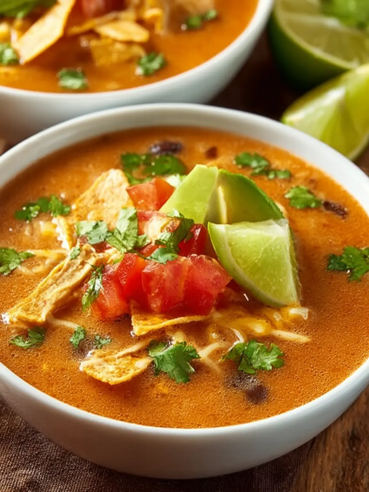 A hearty chicken soup with the flavors of enchiladas, perfect for any meal!