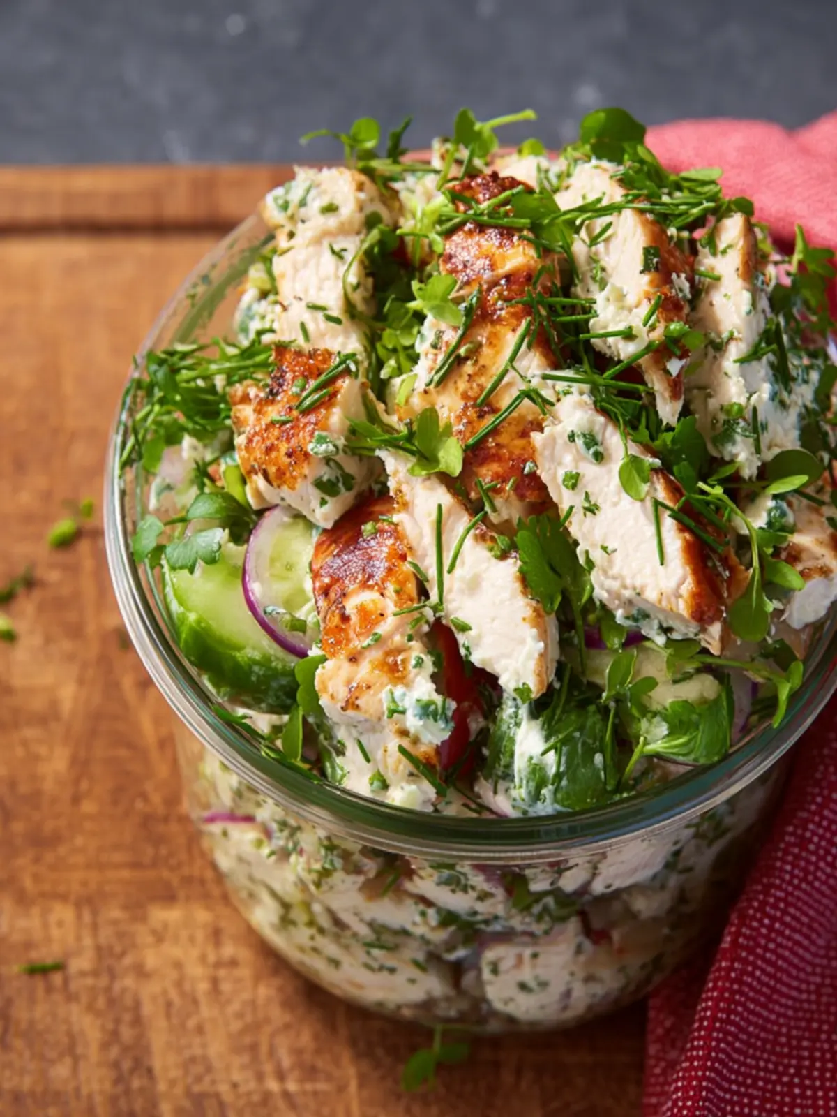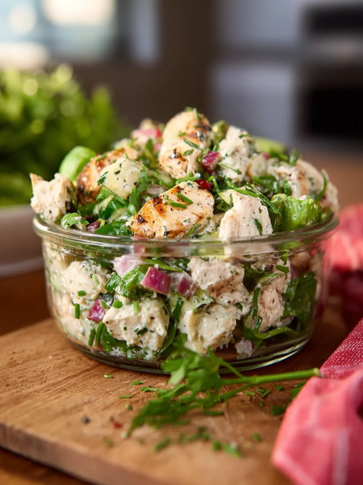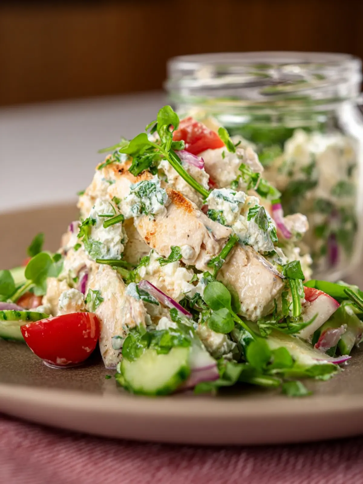 A delicious chicken salad made with Greek yogurt, vegetables, and fresh herbs.
