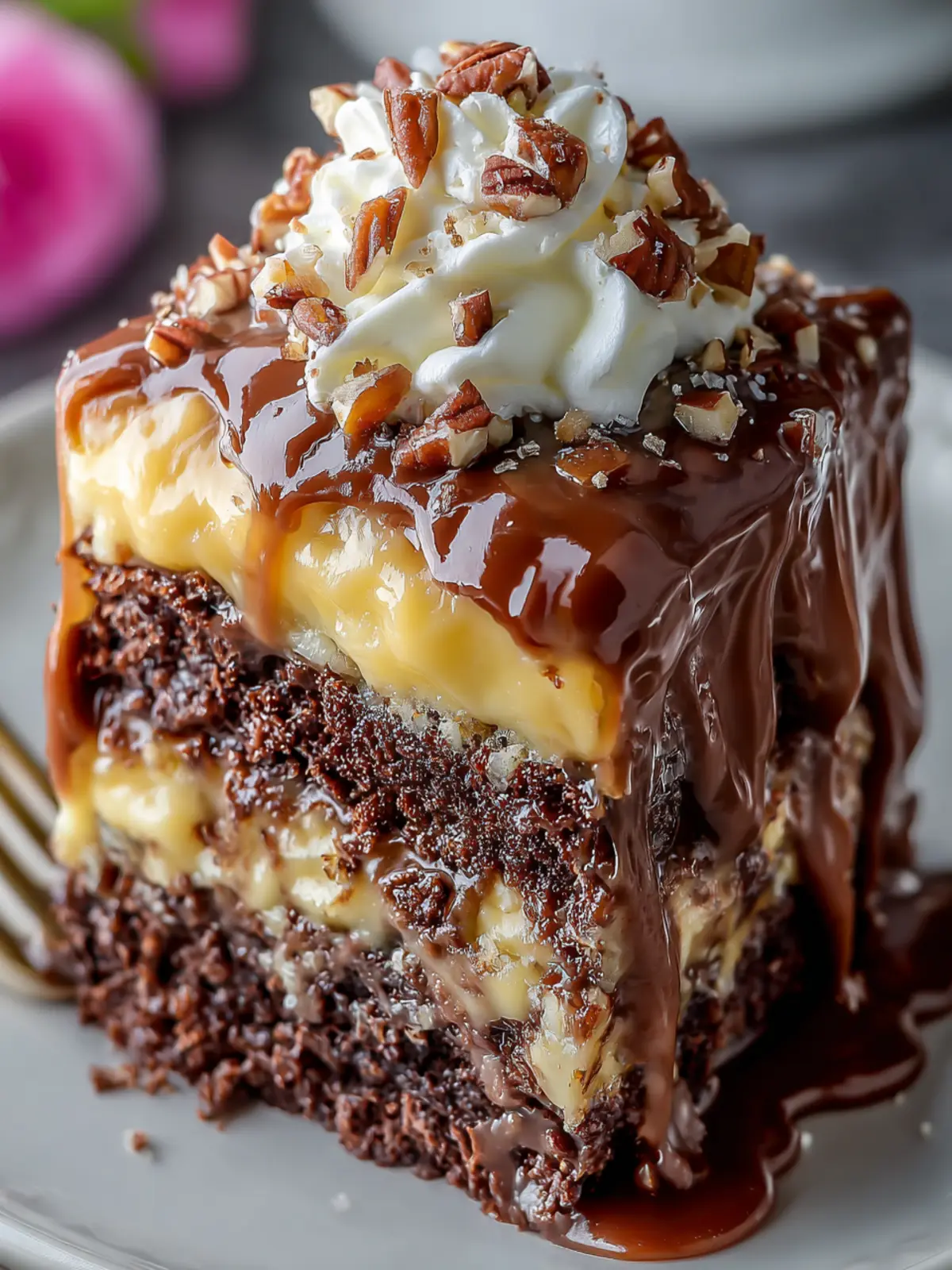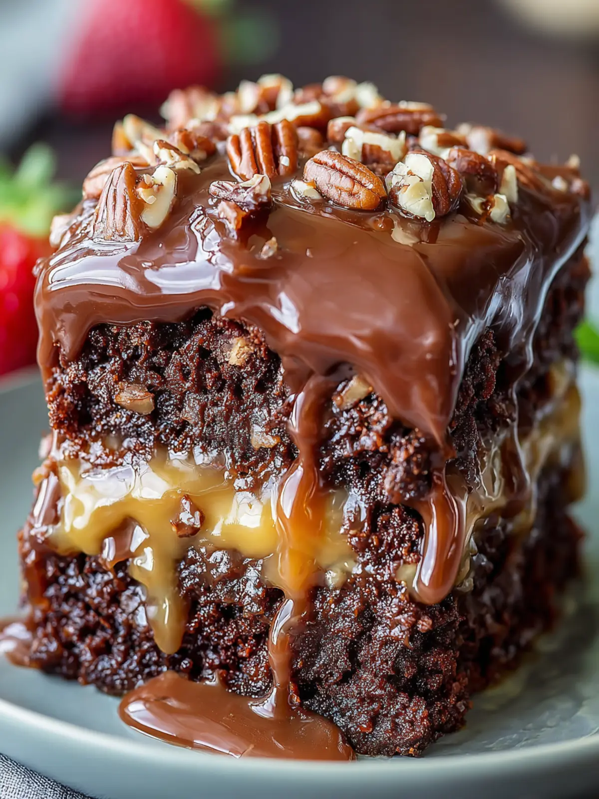 A decadent chocolate cake layered with sweet caramel and crunchy pecans.