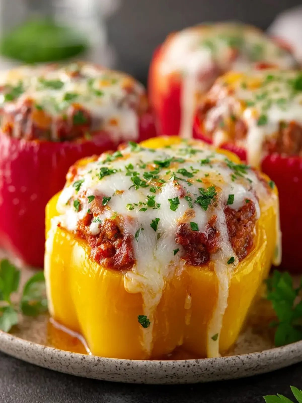 Delicious stuffed bell peppers filled with ground beef, rice, and topped with cheese.